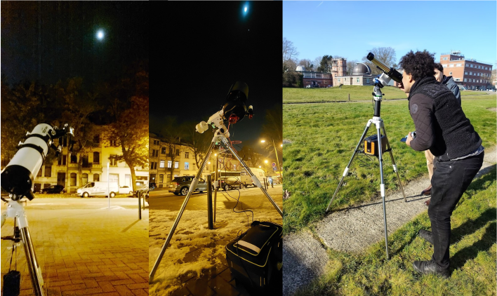 Qu’il s’agisse d’observer les taches solaires en journée ou des planètes à la nuit tombée, notre équipe installe ses télescopes dans des espaces publics à Bruxelles ainsi que sur le site de l’Observatoire royal de Belgique, et invite chacun à regarder à travers l’oculaire.